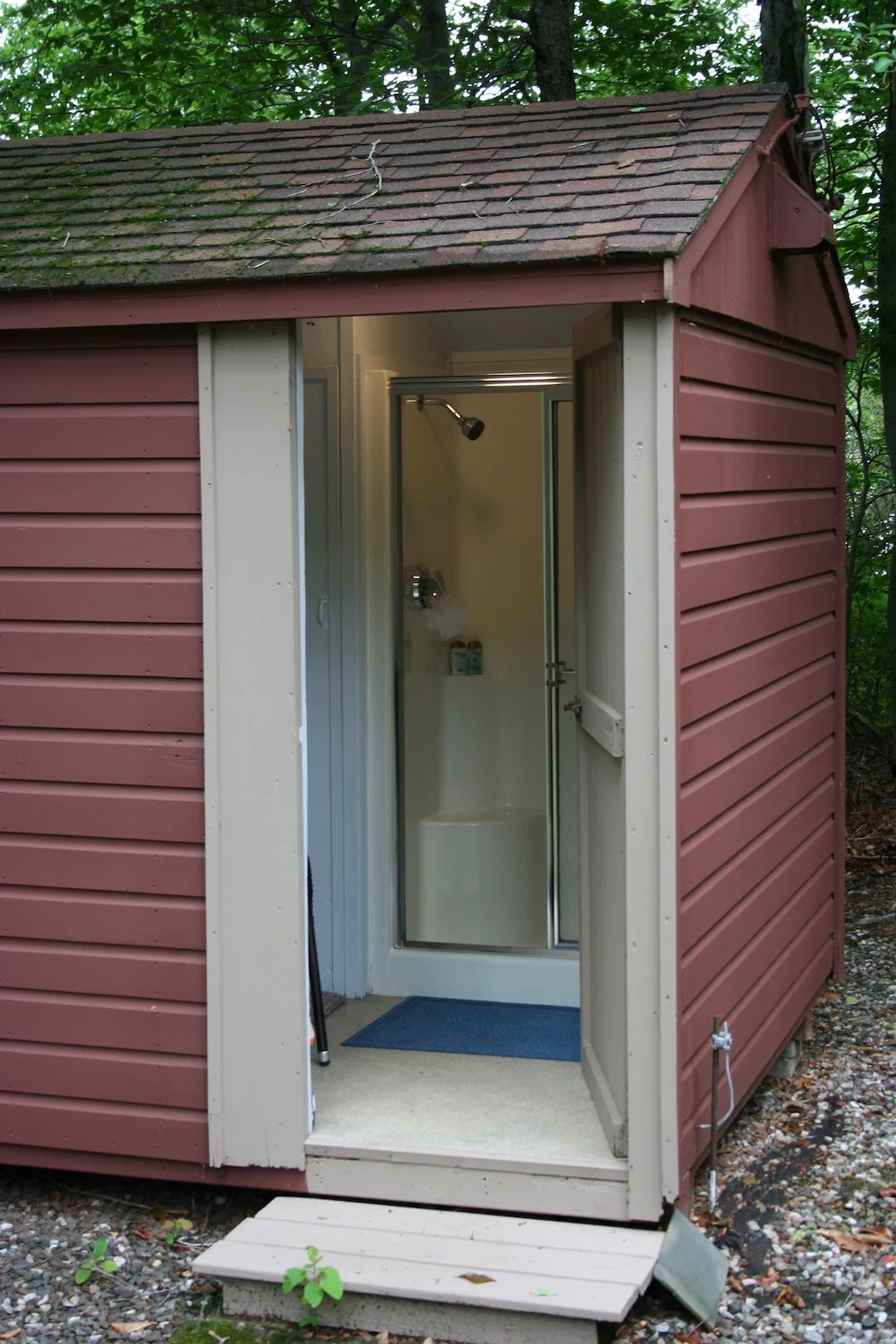 Two private showers and changing rooms are available in the common shower house found on the west side of the field and fire pit area. There is hot water, and they are stocked with biodegradable soap, shampoo, and conditioner.